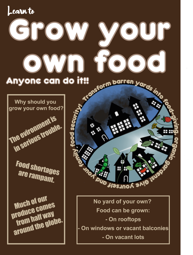 This design uses monochromatic colour in shades of green to give the benefits of urban farming. Because the same base colour has been used throughout, there is very little contrast or urgency surrounding the design, and it struggles to retain the attention of the audience. Although the majority of the informational text is relevant to the cause, it might be more beneficial to highlight key points on the poster rather than put large bulks of text that the audience is unlikely to remember.