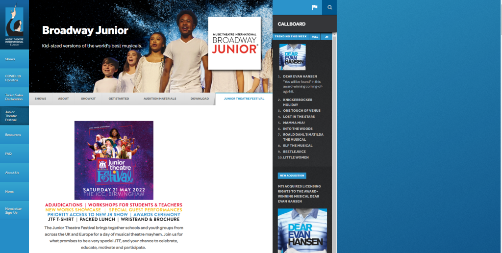 The above is an example of a festival that centres around musical theatre. The website seems quite cluttered and difficult to navigate, with no indication of where tickets can be bought. If the primary focus of the website is to sell tickets then this should be in a place immediately obvious to the user, so they don’t leave the site without purchase.