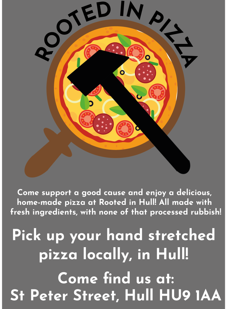 In the brief the client asked for use of the hammer and sickle to portray community. For this logo the sickle has been made to look like a pizza tray for an oven and part of an image from adobe stock has been used of a pizza (Adobe Stock, n.d.) by use of a clipping mask on Adobe Illustrator. The hammer has still been used so the logo has a sense of community and also shows the audience what the purpose of the bakery is. The name “Rooted in Pizza” has been chosen to keep with the Rooted in Hull theme.