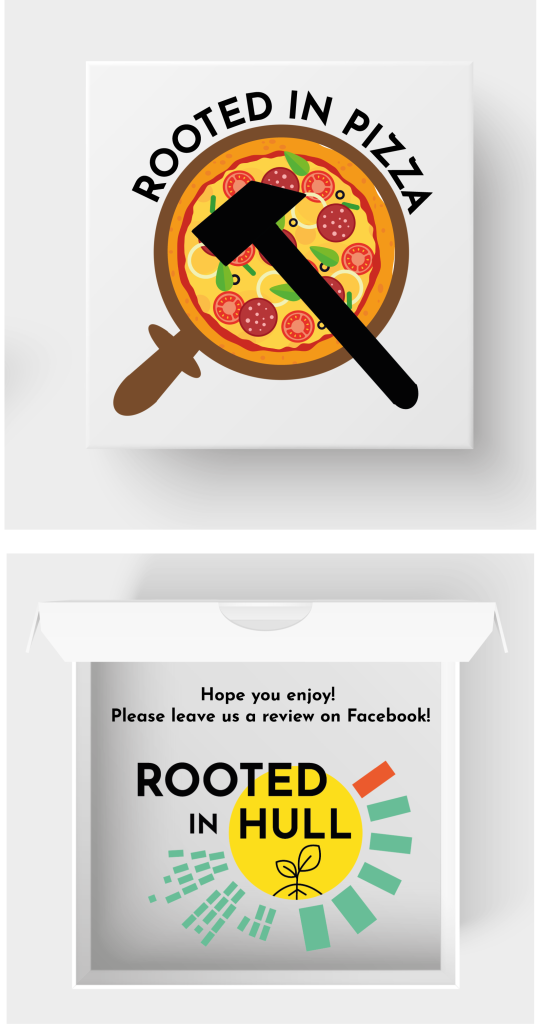 The pizza box branding incorporates the logo created to the client’s brief on the front and the logo for Rooted in Hull on the inside of the box to show their connection. The customer is reminded following consumption of their pizza to leave a review on Rooted in Hull’s Facebook page in an attempt to increase their social media following through recommendation.