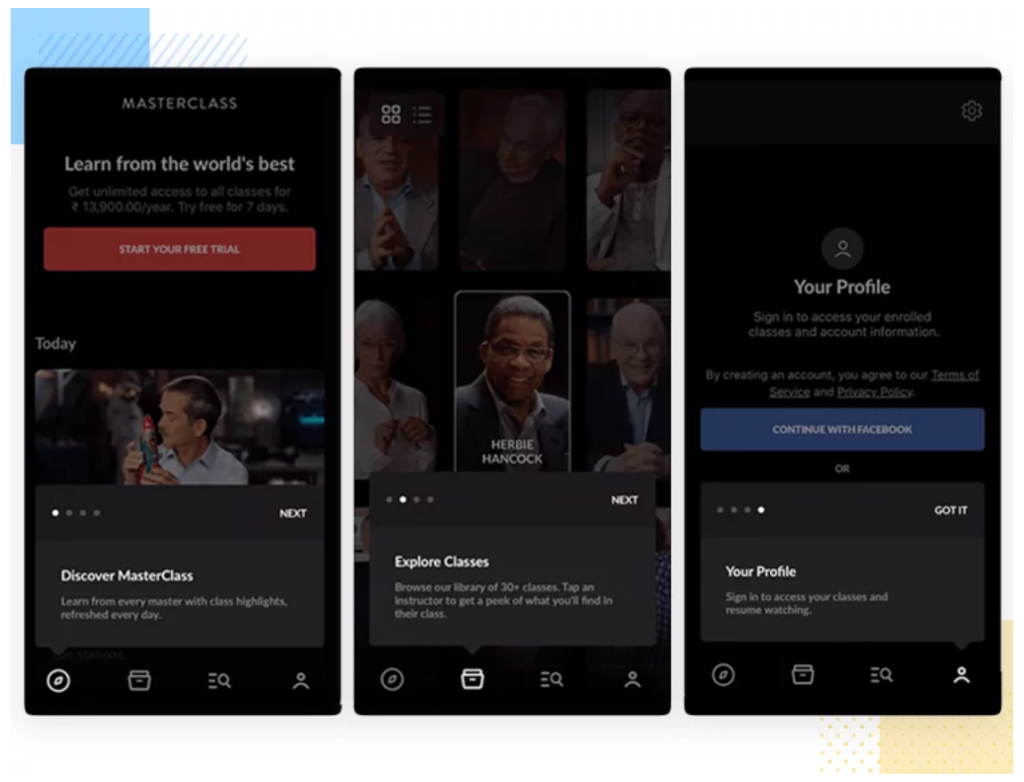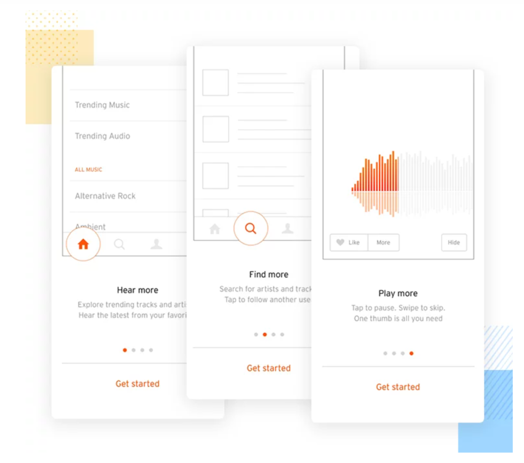 Onboarding for this app has taken inspiration from the images above, and uses an instructional process for the user. As seen in the images above, they are using dots to tell the user how many screens there are remaining of the onboarding, so they can see when they will be able to use the app. If there isn’t an indication as to when they will be able to access the app, the user could get bored and exit before even reaching the main app.