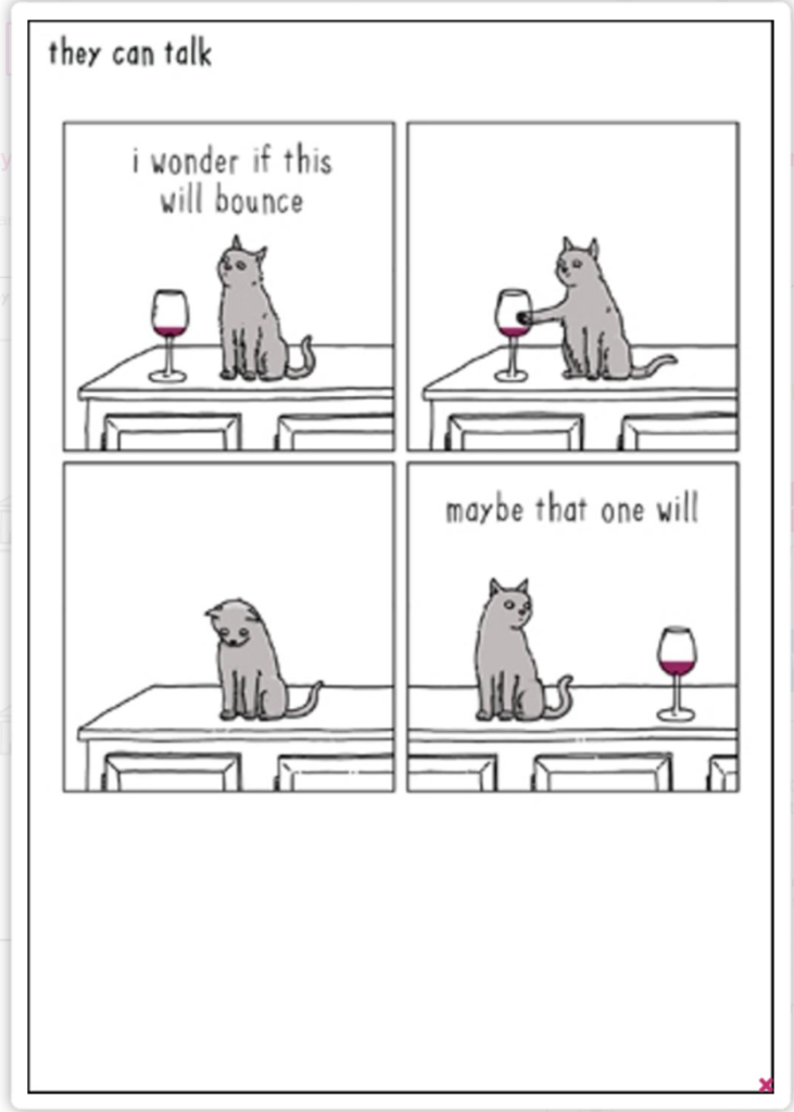 The above is a simple cartoon sequence about a cat with minimal type. This has taken something that happens in everyday life and made it funny through narrated sequence.