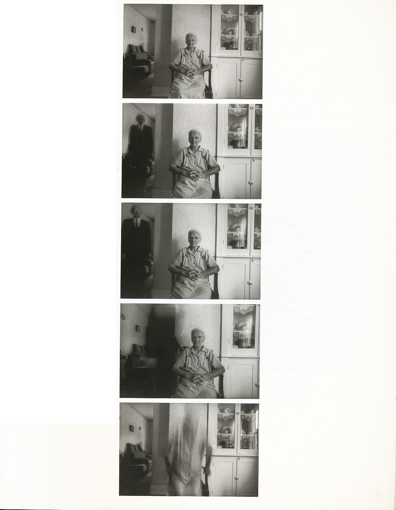 The above is an example of sequential photography. In this series of images you see an elderly woman facing the camera, seemingly unfazed by the man approaching her. The man is symbolising death and when looking through the images, it gives the user a sense of anxiety on her behalf.