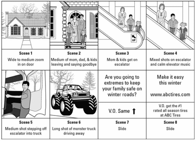 The above is an example of a storyboard. It gives clear sense of direction as to what is needed from the videographer in each shot and uses simple images to further explain what is required.