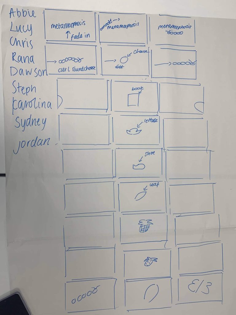 For this task we had to create a flip book entitled ‘Metamorphosis’ which showed a ‘very hungry caterpillar’ entering stage left, eating something, and then exiting stage right. As the leader, I was given the role of designing the title sequence at the beginning. The following is our planning in session for what each person wanted their caterpillar to eat: