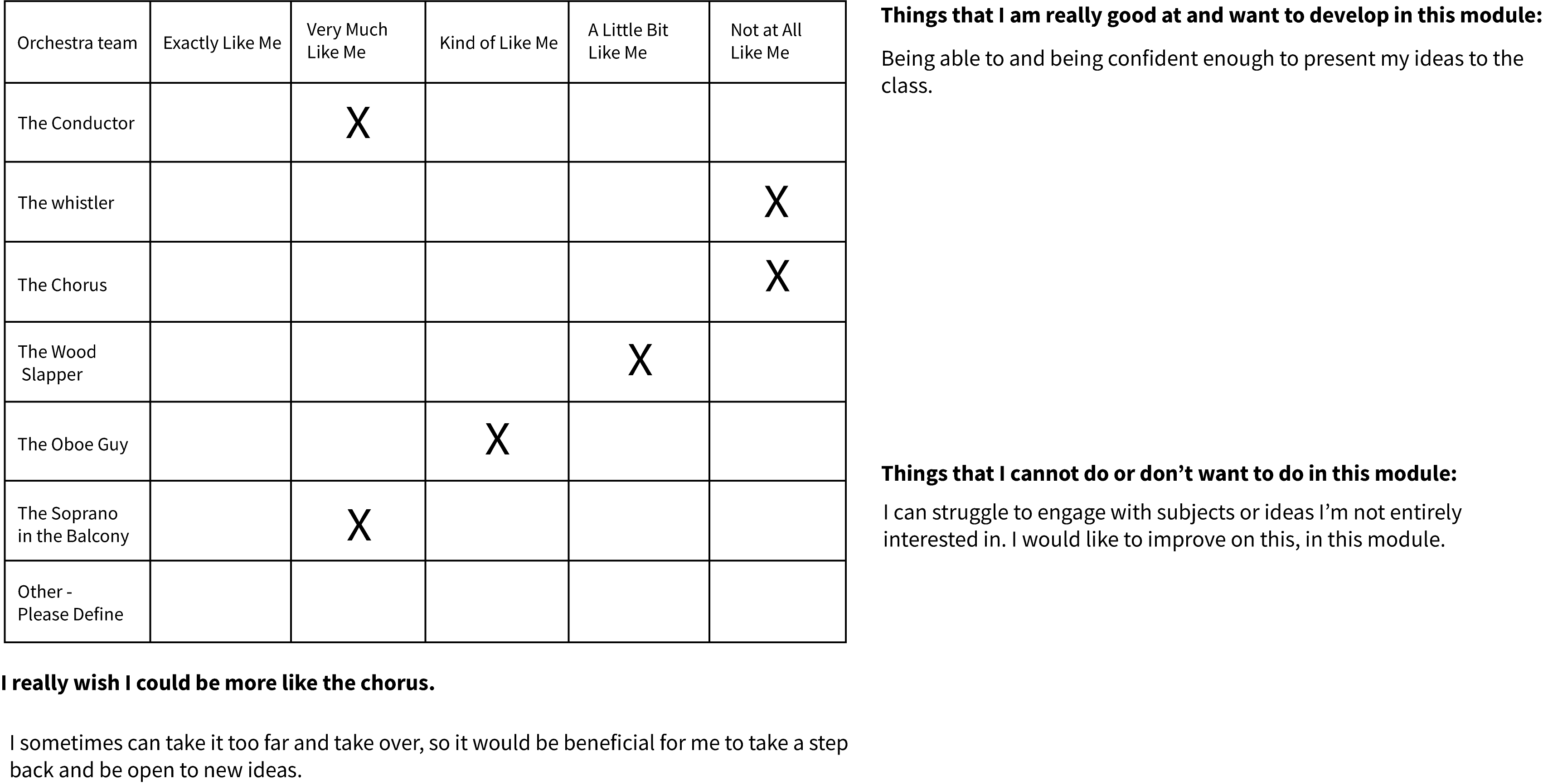 Following the questionnaire, I determined that I was most like the conductor, but I can sometimes take it too far and be overbearing with my ideas. Following discussion with the rest of the group, they agreed that I was most like the conductor and exhibit leadership qualities. To improve in the future, I would like to be more open to other people’s ideas and encourage people who are more introverted than myself to input their ideas, rather than go along with my ideas.