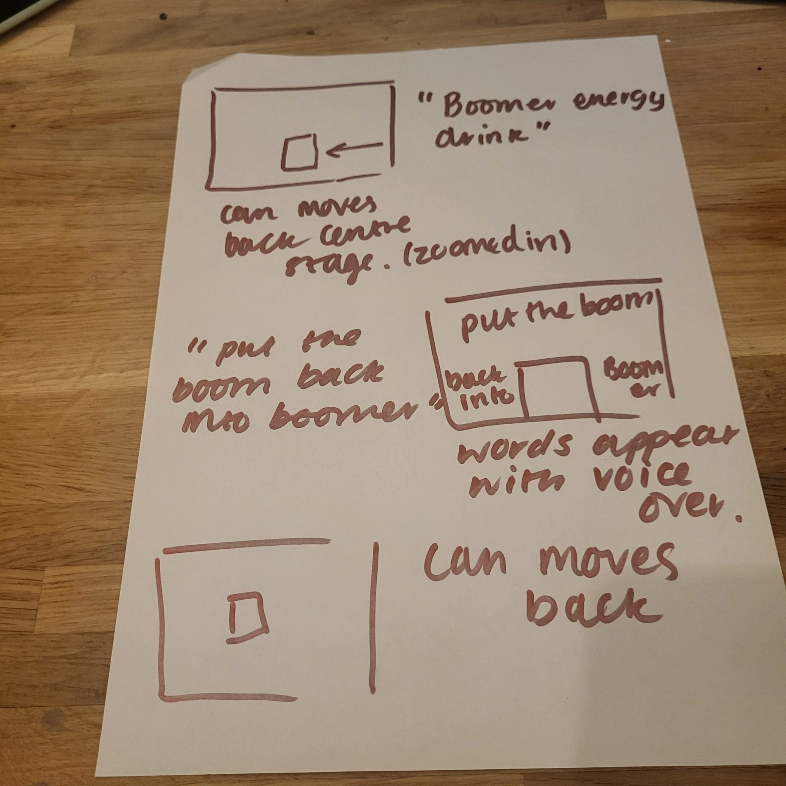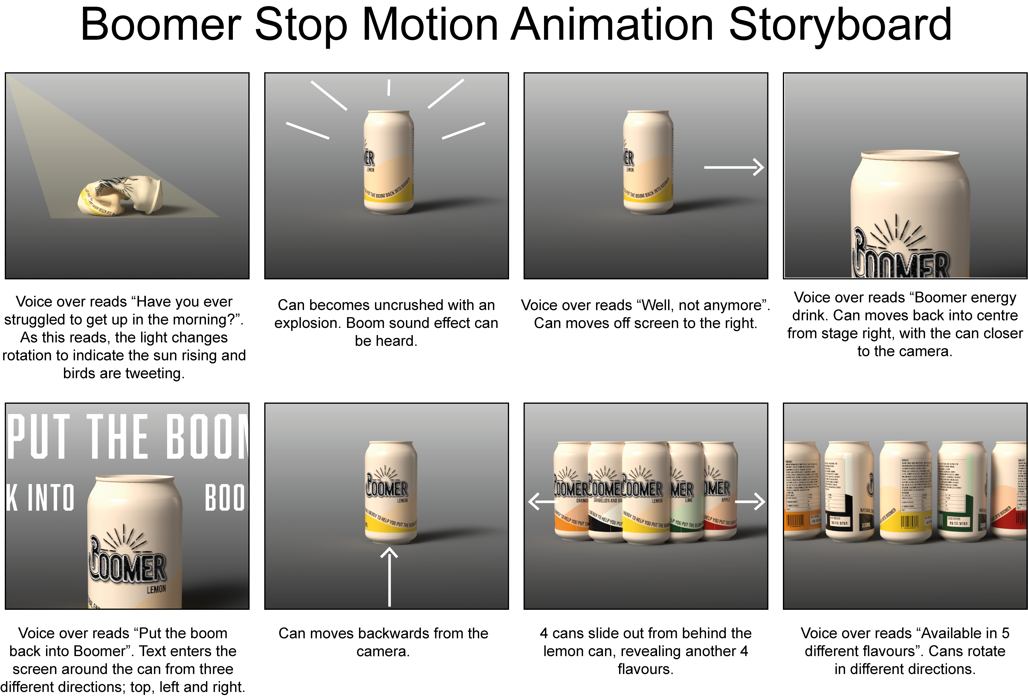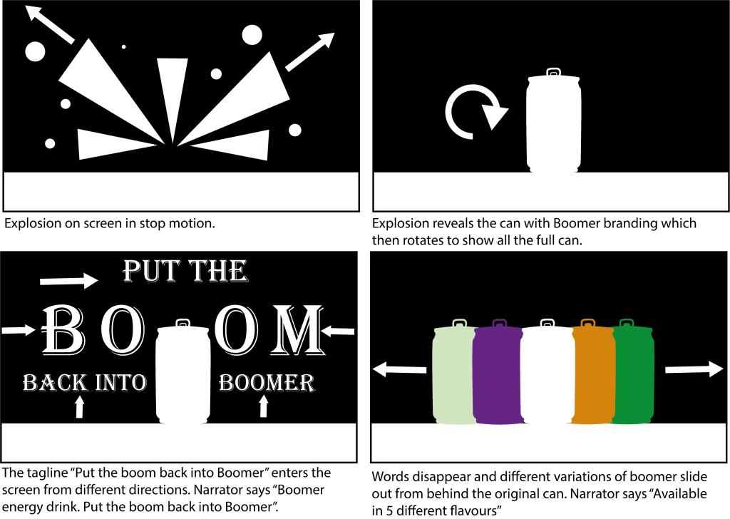 Following review of the first draft of the storyboard for Boomer (Fig 1), I thought about the reason why I had chosen the transitions and movements, and realised that a lot of them weren’t helping with the message of the brand where they could be.