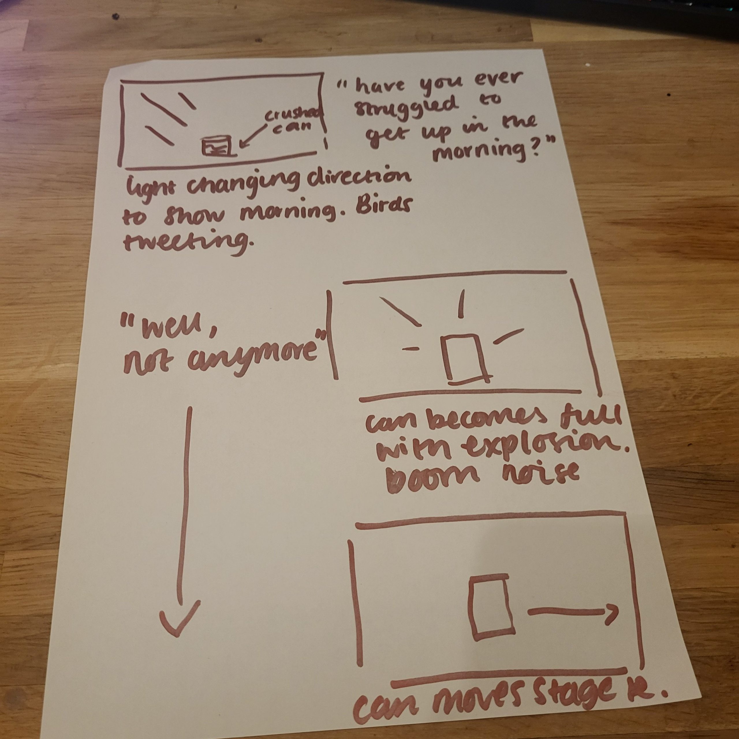 I start my animation with a crushed can and a voice over reading “have you ever struggled to get up in the morning?”. The crushed can symbolising the struggling to get up in the morning, in the same way it would be extremely difficult to un-crush a can. While this is being shown, I have adjusted the light on the first frame to make it appear as if the sun is coming up, indicating morning and adding the sound of birds tweeting.