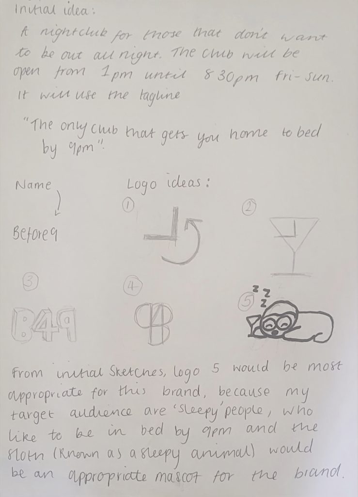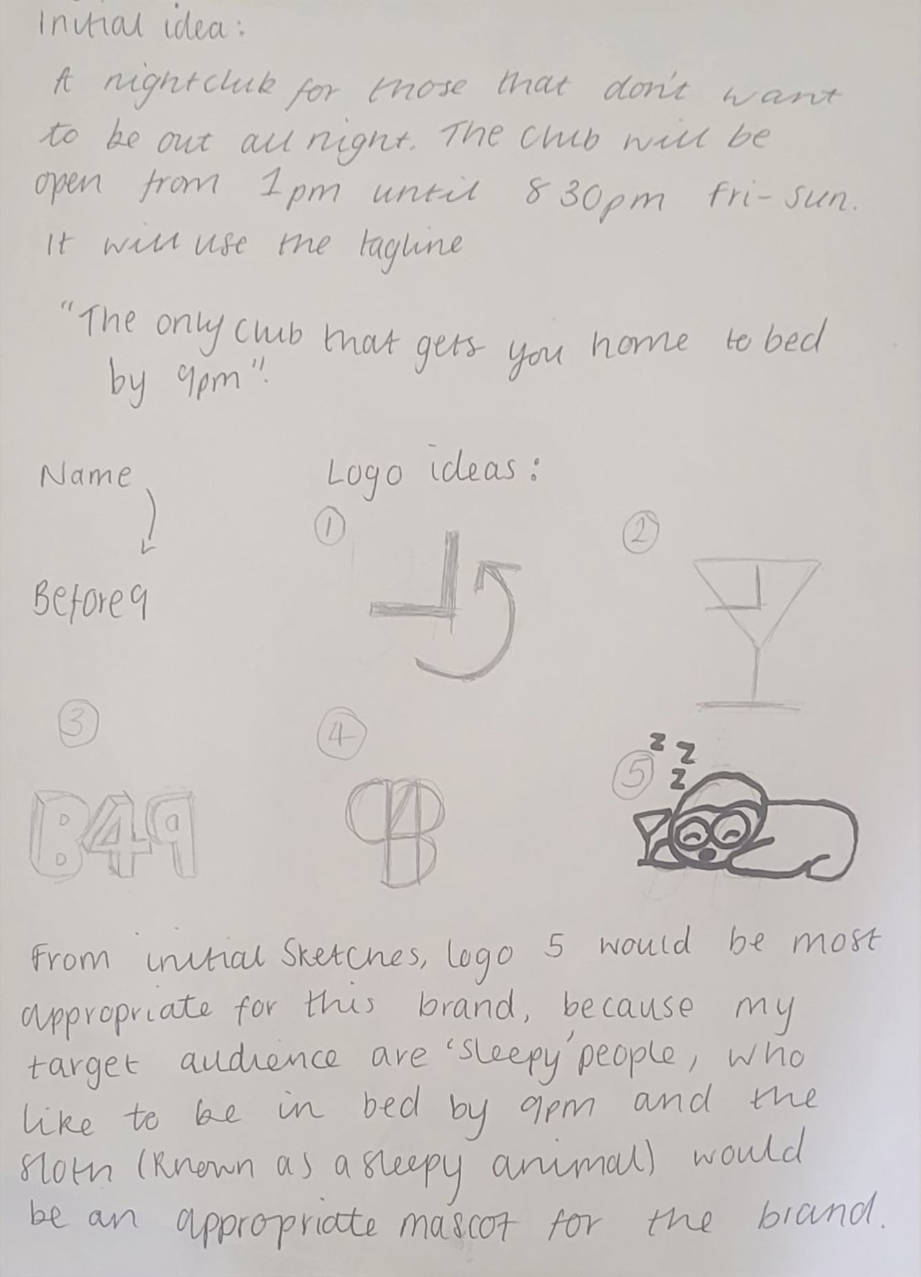 For this brand, it was decided that a character would be created that could be used in advertising, including for print the club, to make the brand more recognisable to its customers. Due to the sloths sleepy nature ( Animal Hype, 2023) and the target audience being people who want to be in bed by 9pm, it was decided that a sloth along with a colour palette centred around blue (which is known to be associated with sleep) would be used for this brand.