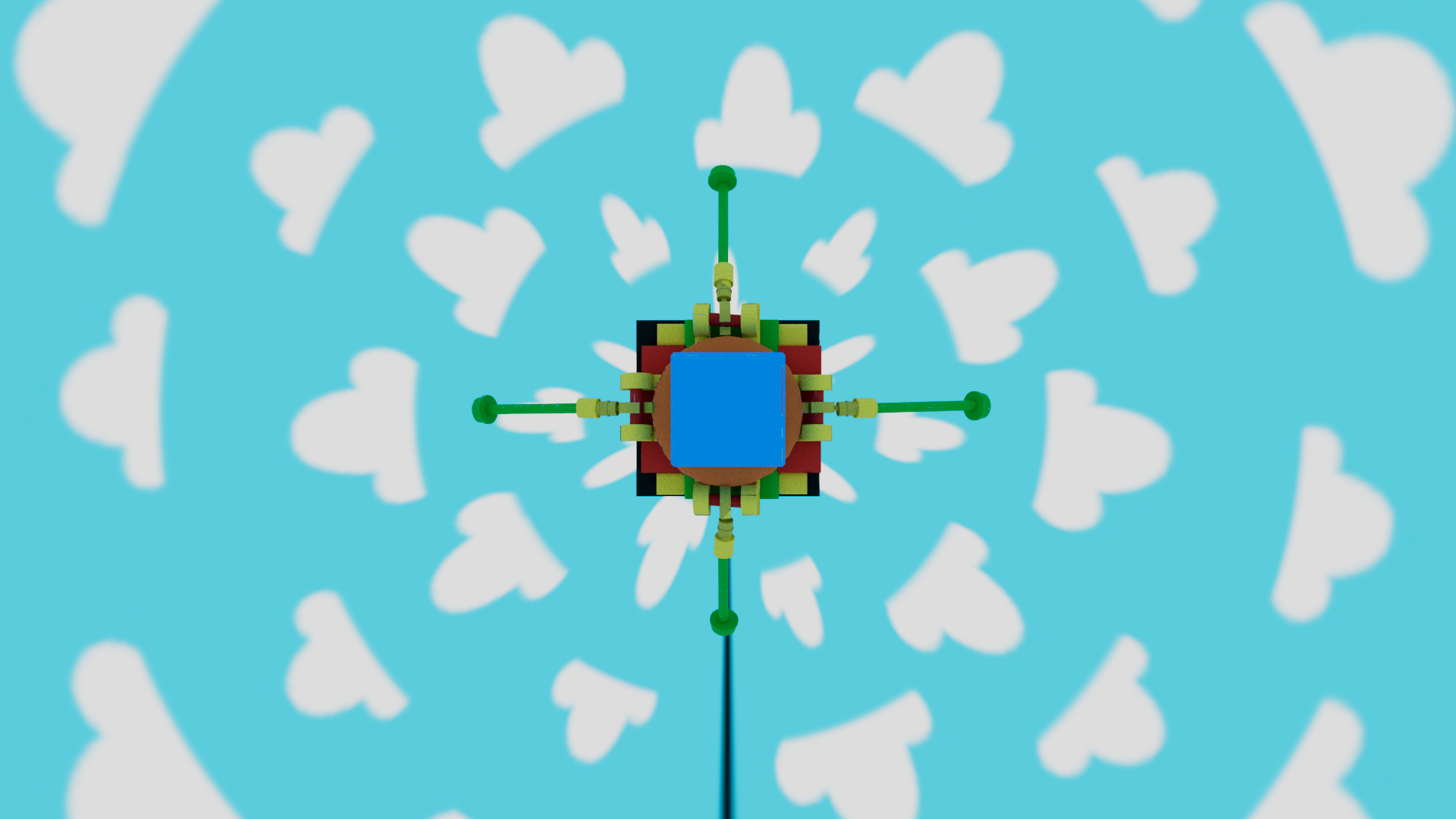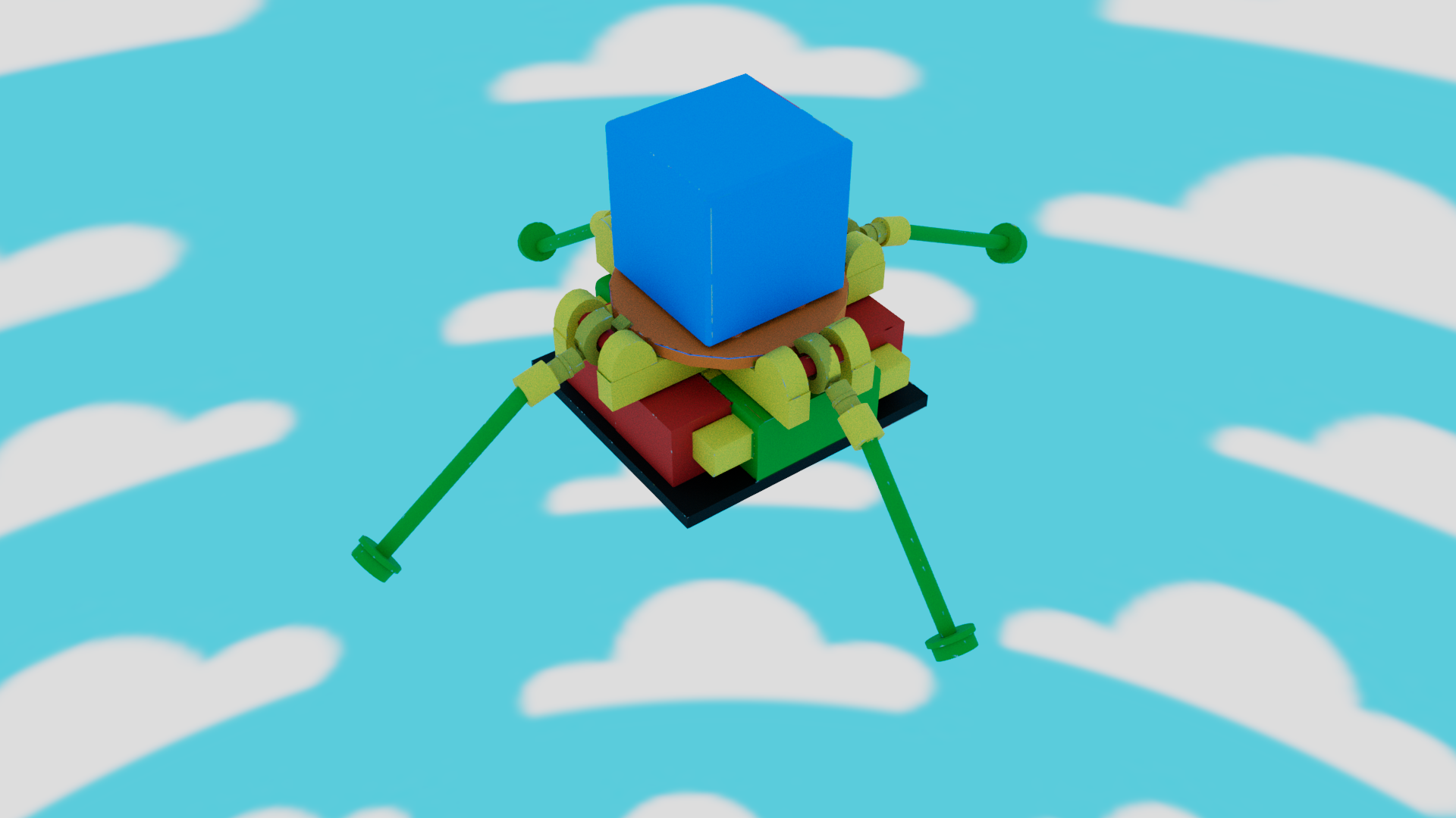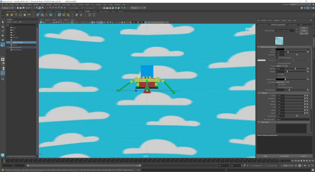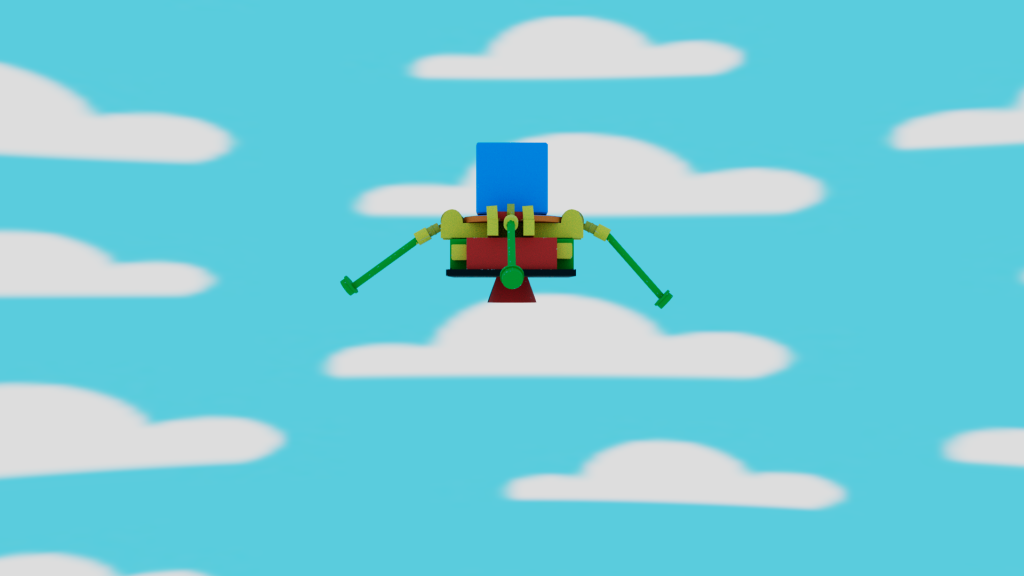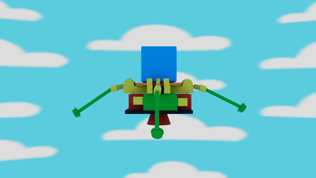 For my model I wanted to create a Lego themed escape pod, so I used bright colours and used a glossy plastic material to give the model a plastic block look. I then created a simple sky background to keep with the child-like/ toy theme in illustrator and applied this to the scene, ready for animating.