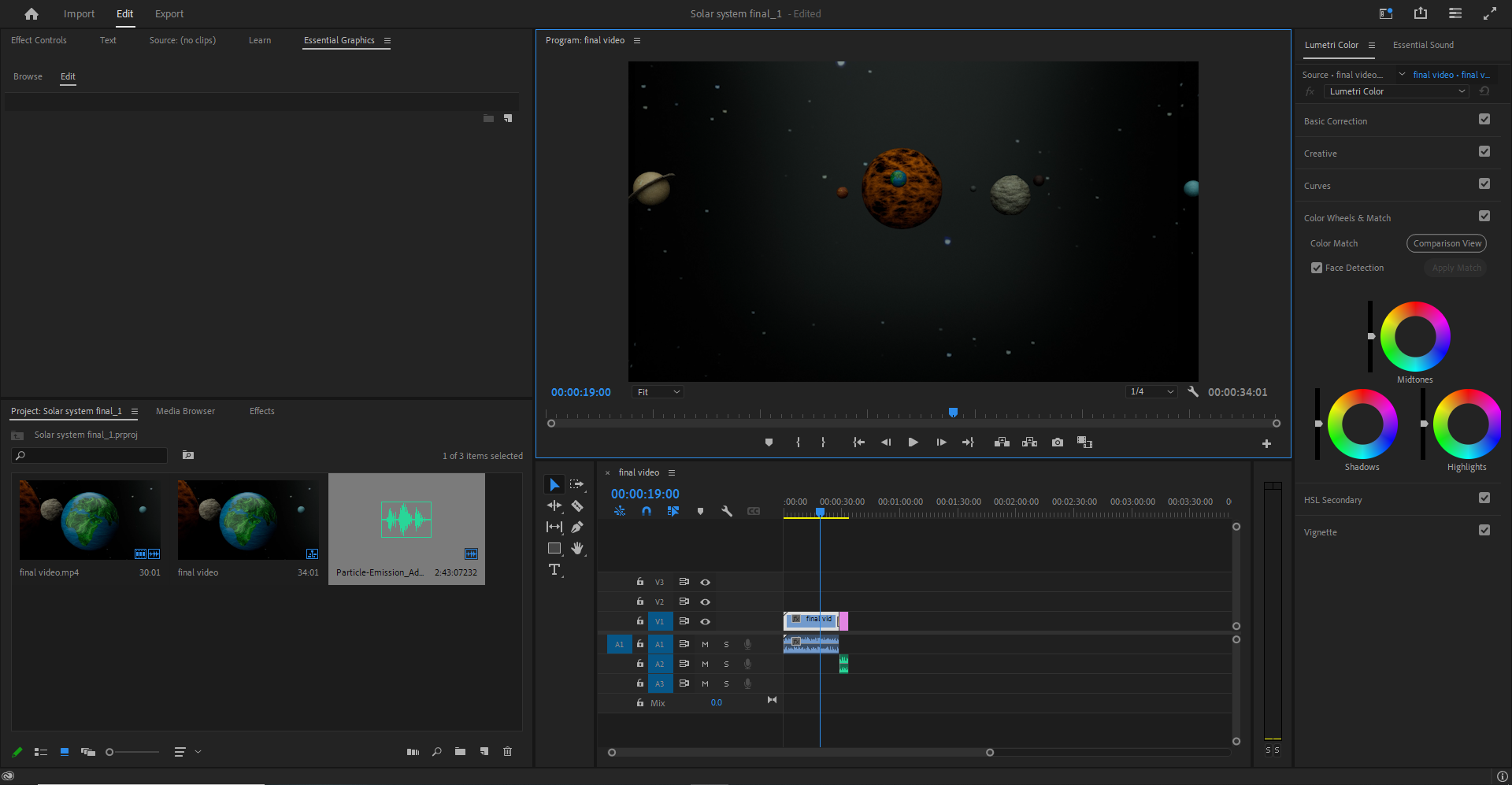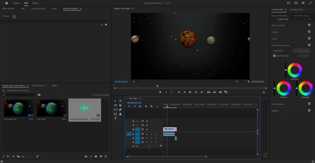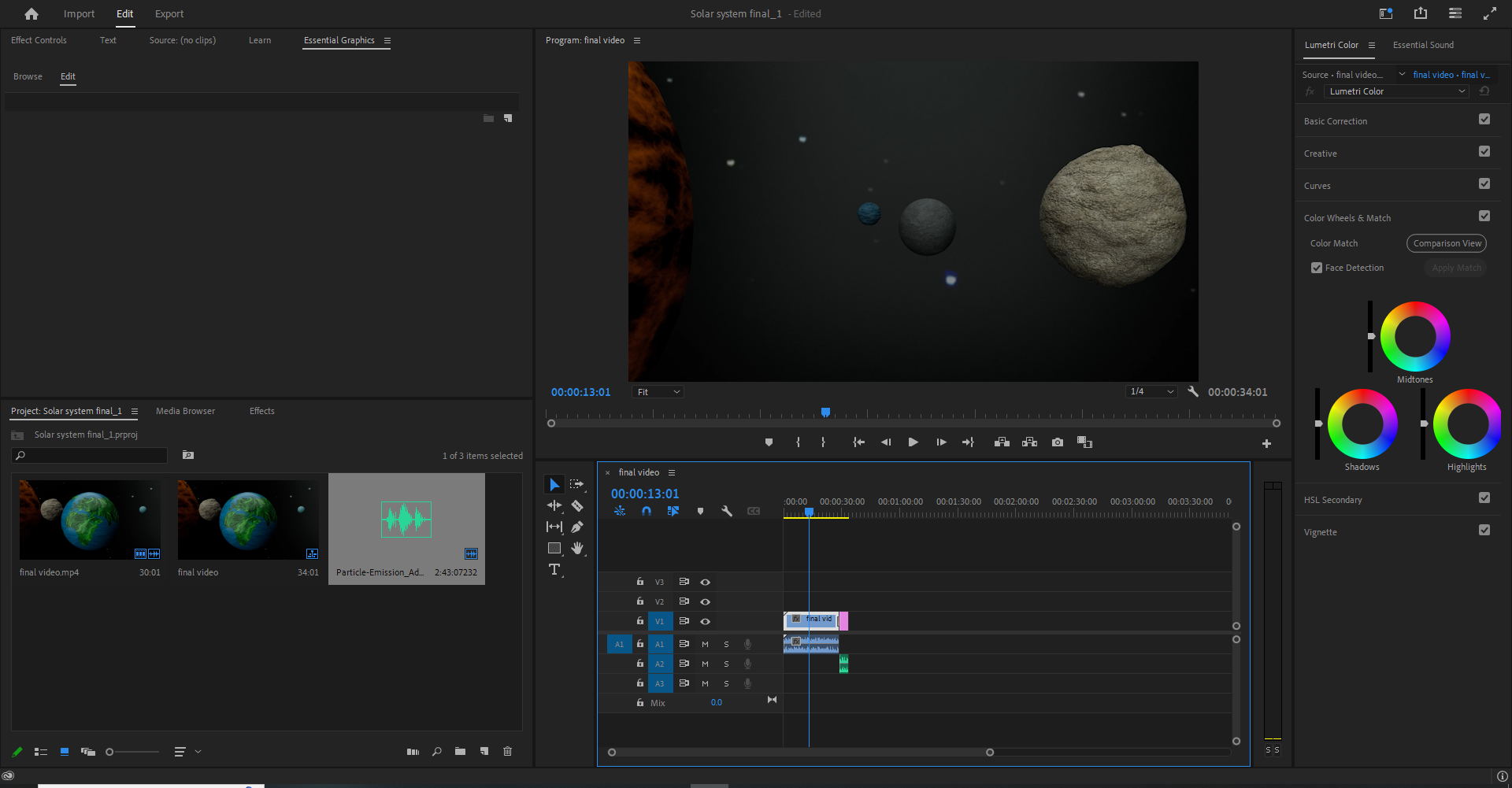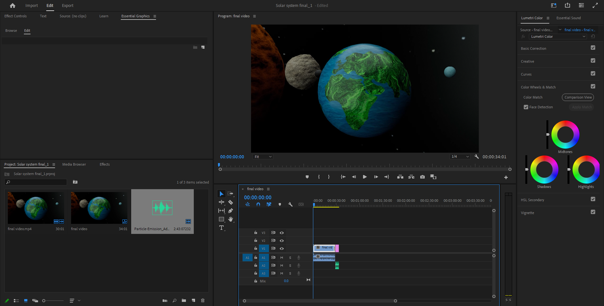 For use of colour, I ensured that I used the colour as a noun, so blue is water, green is land for my render of earth. I also used a texture that had varying shades for each to try and represent depth and give the Earth a more life-like look. I decided to use a brighter green and blue, to signify that Earth was the main focus point for this part of my animation.