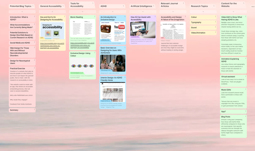 My initial concept when submitting the quiz choosing our major project was “An Exploration of How Design Can be Made More Accessible for Those with Neurological Disabilities, Including How AI Can be Used as a Tool for Accessibility.”. This is due to my interest in how graphic design can be improved to make things more accessible to those with health issues. Following discussion around ethics approval and time limitations, I decided to focus on one health condition; ADHD. I chose ADHD because as someone who has been recently diagnosed, I can input some of my personal experience without necessarily needing ethics approval.