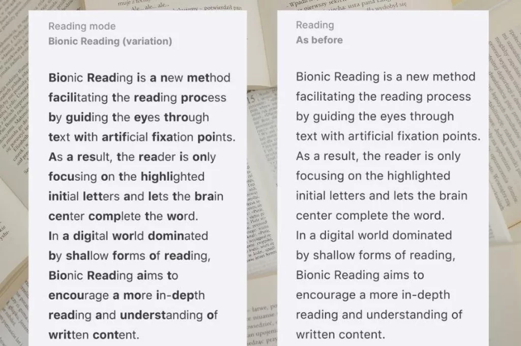 A fairly new method that could be used is bionic reading. Bionic reading is a method of reading information that highlights the most concise part of the word in bold. This allows the brain to pick up the previously learned word more quickly, which could help significantly with those with ADHD and/or concentration issues (Bionic reading, 2021).