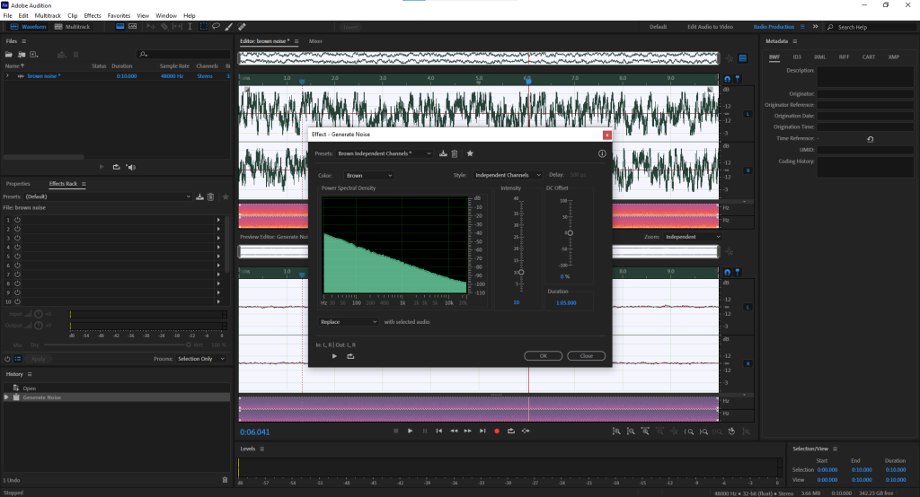 The brown noise sound effect was then created using Adobe Audition, with the volume altered to make the noise more ambient to the video.