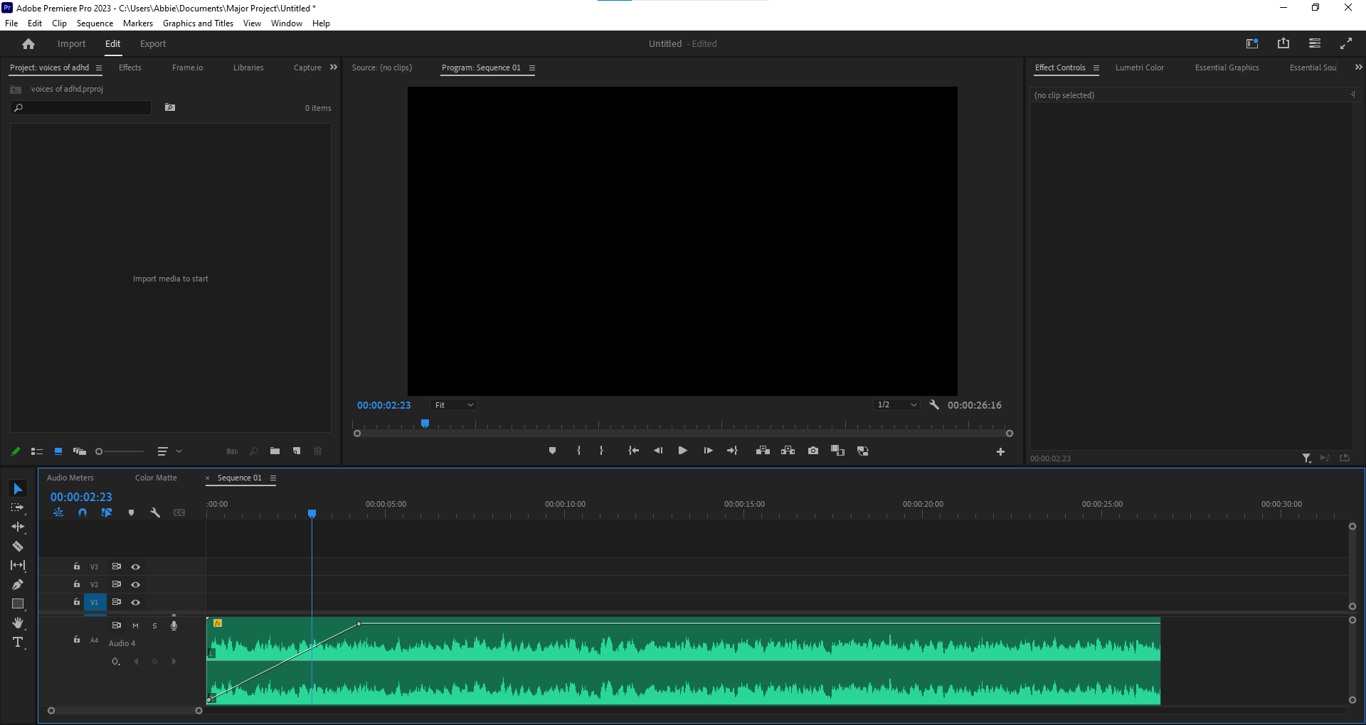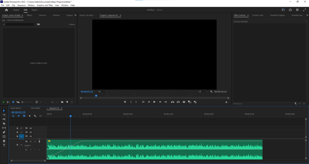The first sound that was added to the timeline for the introductory video for the website, was the social media videos with the topic of ADHD. The volume levels were increased because the plan was to keep the first half of the video quiet and use the shock of the sudden increase in sound to gain the attention of the audience if they get distracted (Dickinson, 2021).